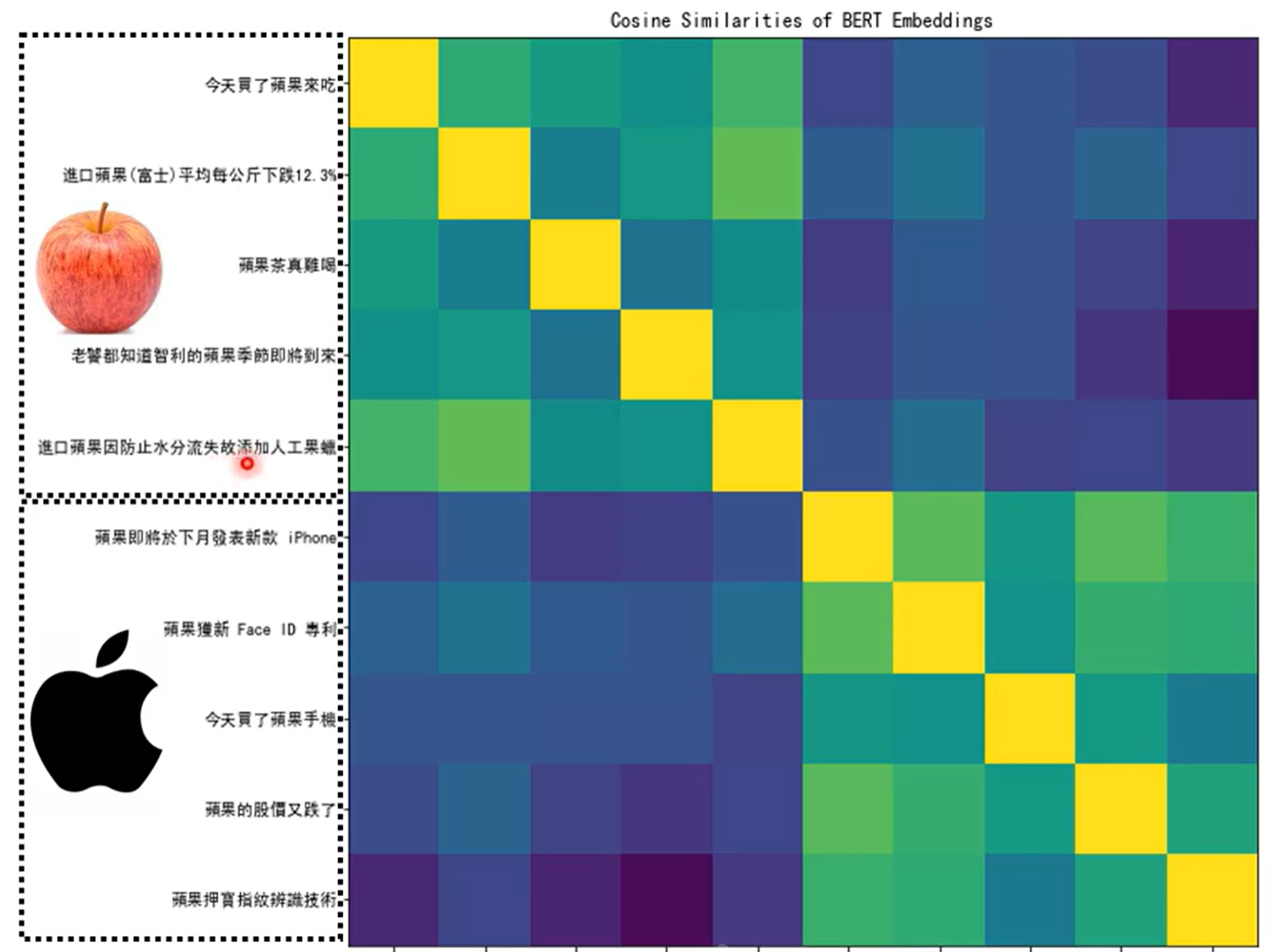 计算一下余弦相似度:即学会饿了区分“果”的不同。